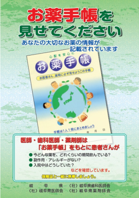 お薬には主作用(病気を治す効果)以外に副作用もあります。また薬には相互作用(飲み合せ)もありまた近年はジェネリック医薬品の普及により、同じ成分の薬でも名前、概観が違う薬が何種類も存在し重複服用をする可能性が増えてまいりました。こういったお薬による健康被害を回避するためにお一人一冊お持ちいただき、医療機関や薬局に行くときはお薬手帳を持参して下さい。